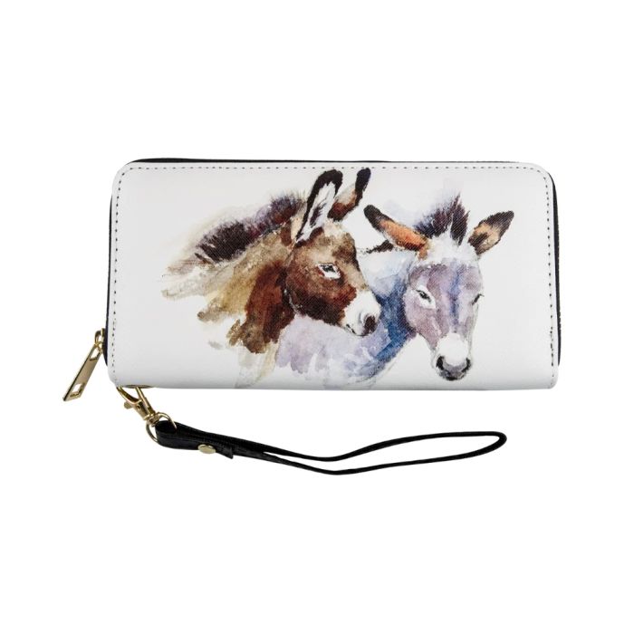 These clutch wristlet wallets feature beautiful horses and adorable donkeys.  Three sided zipper secures contents.  Inside are plentiful compartments for cash, cards, etc.