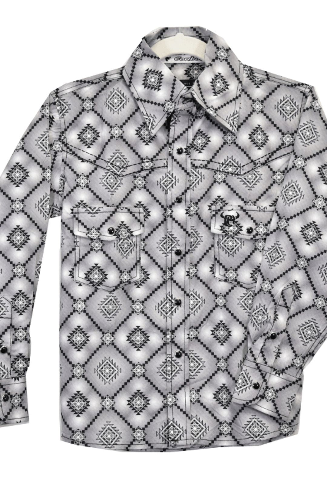 This long-sleeved Western-style shirt has a grey diamond Aztec design, adding a touch of southwestern flair to this stylish shirt. It's perfect for any occasion, from school to playtime to family gatherings.