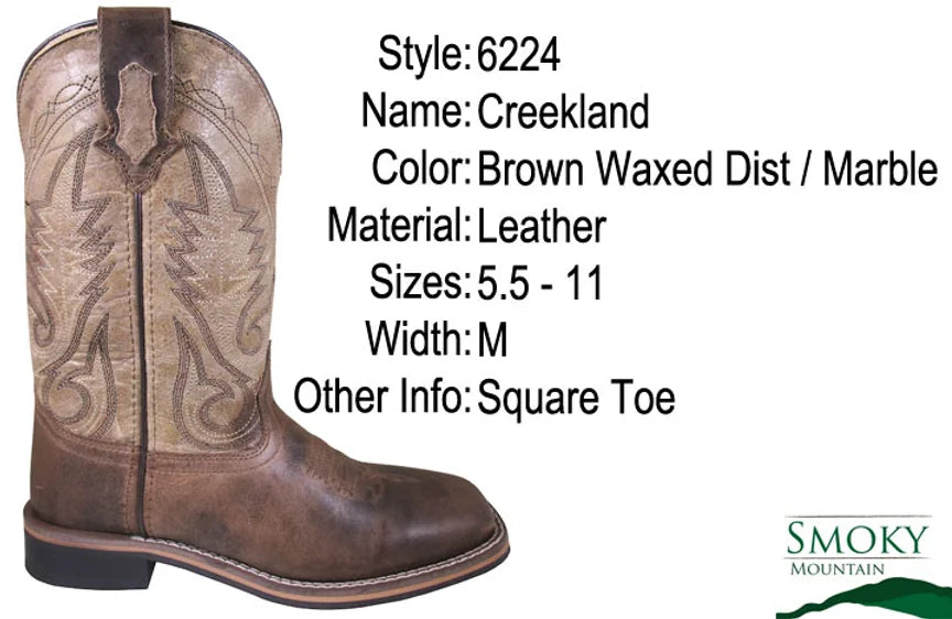 Smoky Mountain Boots womens Creekland is a classic cowboy boot with distressed brown leather vamp and light brown stitched and distressed shaft.  Comfortable padded footbed, rubber sole.