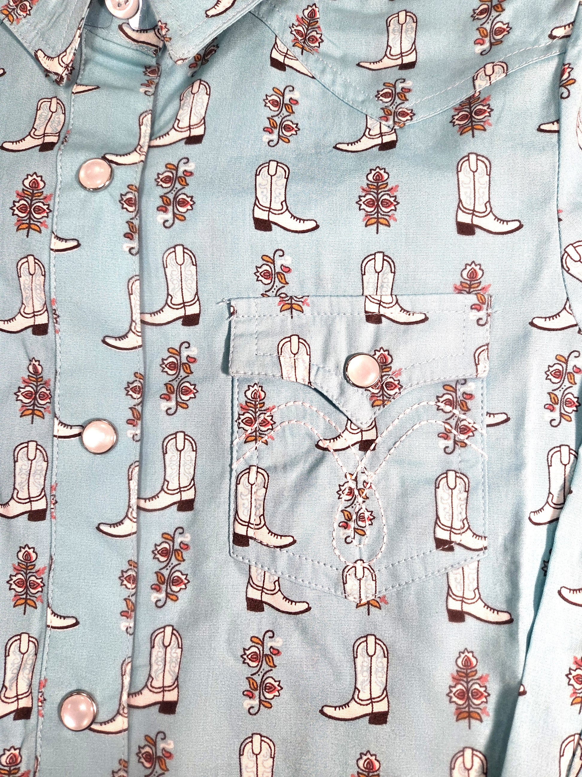 100% Cotton Panhandle Slim girls cowboy boot print turquoise snap western shirt.  Double chest snap flap pockets with heavy stitching, western yoke front and back.