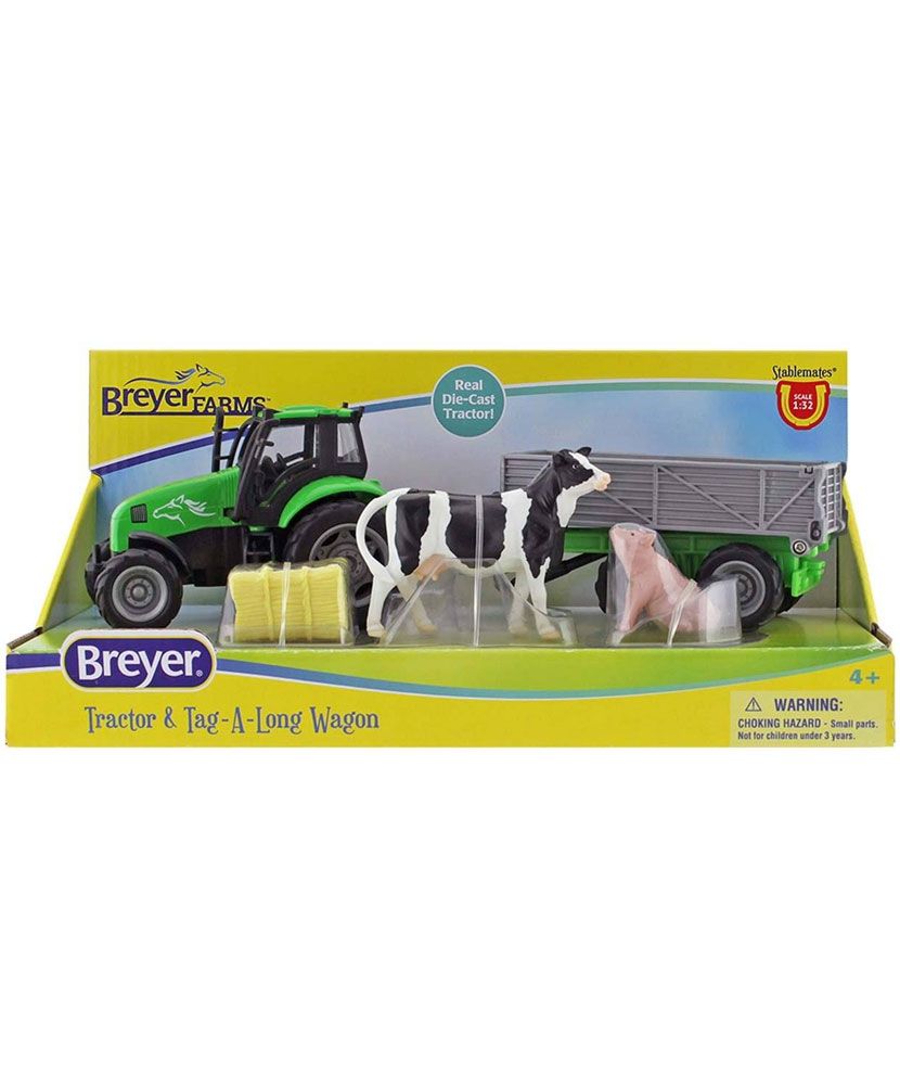 No farm is complete without a tractor and wagon to get the job done. Breyer's die-cast tractor has rolling wheels and hooks up to pull the tag-a-long wagon with ease. Need to empty the wagon? Just push the lever to lift the wagon bed up for easy dumping! Comes complete with a cow, pig, and hay bale.